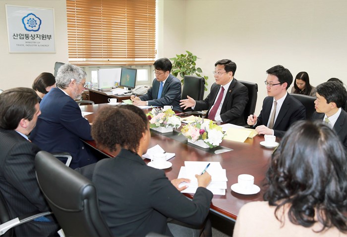 (서울=포커스뉴스) 주형환 산업통상자원부 장관은 29일 오후 서울 종로구 정부서울청사 외교부 집무실에서 ‘한미 과학기술협력 공동위원회’에 참석하기 위해 방한중인 존 홀드렌 (John P. Holdren) 미국 백악관 과학기술정책실장(장관급)의 예방을 받고, 한.미 양국간 기후변화대응, 에너지신산업 등 에너지정책에 대해 의견을 교환하고 있다. <사진제공=산업통상자원부>