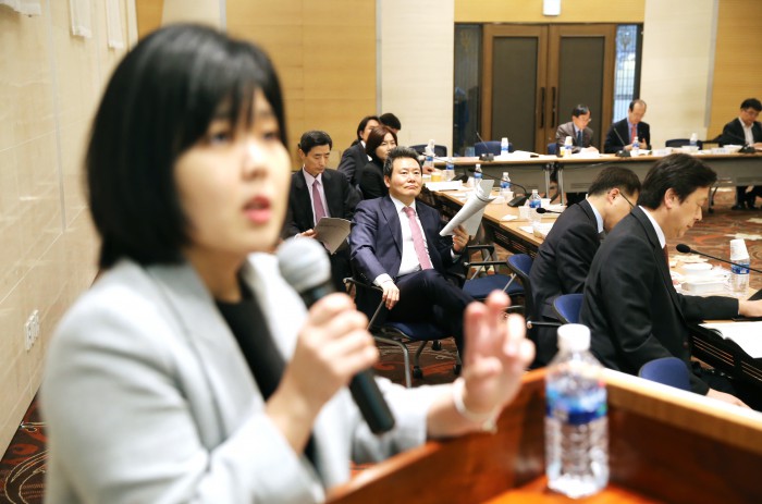 이날 참석자들도 대형유통업체의 특약매입에 따른 과도한 수수료와 비용전가의 불공정행위 개선을 위해선 특약매입 비중 감소를 지속적으로 추진하고, 불공정행위에 대해선 선진국과 같이 강력한 정부 재제가 필요하다는 데 의견을 같이 했다.정수정 중소기업연구원 연구위원(맨 왼쪽)이 29일 중기중앙회에서 개최된 창조경제확산위원회에서 대규모 유통업의 불공정행위 개선을 위한 제안을 발표하고 있다.<사진제공=중기중앙회>