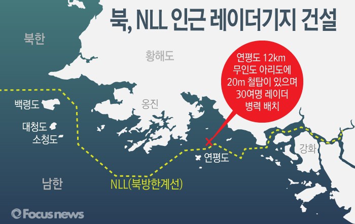 (서울=포커스뉴스) 29일 군 관계자에 따르면 연평도에서 12km 정도 떨어진 무인도 아리도에 20m 정도 높이의 철탑이 세워져 있으며, 30여명의 레이더병력도 배치돼 있다고 전했다. 최근 북한은 무인정찰기 활동을 강화하는 등 우리 군의 움직임을 면밀히 포착하고 있는 것으로 전해졌다.