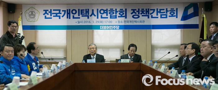 (서울=포커스뉴스) 김종인(왼쪽) 더불어민주당 비대위 대표가 29일 오후 서울 강남구 전국개인택시회관에서 유병우 전국개인택시연합회장 등 참석자들과 정책간담회를 하고 있다.