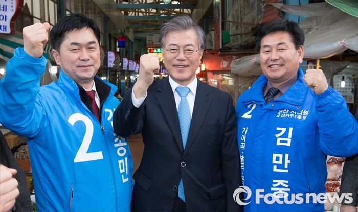(논산=포커스뉴스) 문재인 더불어민주당 전 대표가 29일 오후 충남 논산시 중앙시장을 방문해 김종민 후보의 지지를 호소하며 파이팅을 하고 있다.