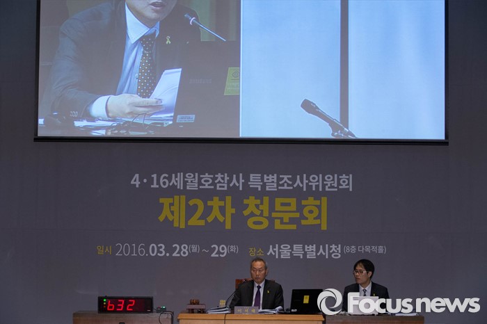 그는 "국정원에서는 두 번의 문자 말고는 연락한 적이 없다고 했다. 그럼 증인은 기억이 없다고 거짓말하고 국정원도 거짓말한 것 아닌가"라며 "국정원과 세월호가 특별한 관계가 있다고 나왔다. 선사와 어떤 관계가 있는지는 다음 청문회에서 밝히겠다"고 말했다.(서울=포커스뉴스) 29일 오전 서울시청 다목적홀에서 세월호 참사 특별조사위원회의 제2차 청문회가 열렸다. 조사위원들이 증인에게 질문을 하고 있다. 2016.03.29 이승배 기자