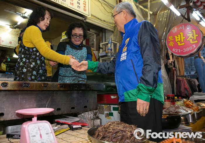 (서울=포커스뉴스) 김종인 더불어민주당 비대위 대표가 29일 오후 서울 송파구 새마을시장을 방문해 상인들과 인사하며 지지를 호소하고 있다.