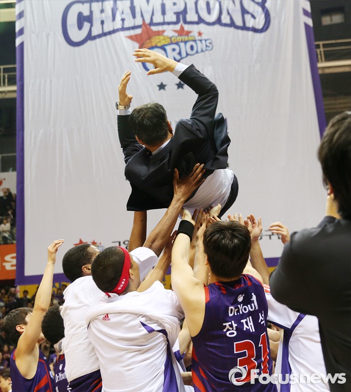 (고양=포커스뉴스) 29일 고양체육관에서 열린 2015-2016 프로농구 챔피언결정전 6차전에서 승리하며 4승 2패로 우승한 오리온 선수들이 추일승 감독을 헹가래하고 있다.