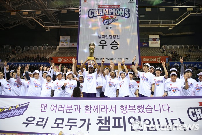 (고양=포커스뉴스) 29일 고양체육관에서 열린 2015-2016 프로농구 챔피언결정전 6차전에서 승리하며 4승 2패로 우승한 오리온 선수들이 두번쨰 우승을 자축하고 있다.