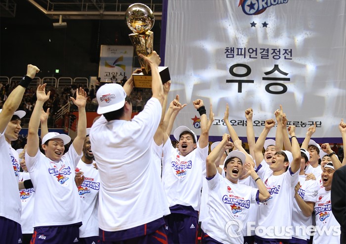 (고양=포커스뉴스) 29일 고양체육관에서 열린 2015-2016 프로농구 챔피언결정전 6차전에서 승리하며 4승 2패로 우승한 오리온 주장 김도수가 우승 트로피를 들어 올리자 선수들이 환호하고 있다.