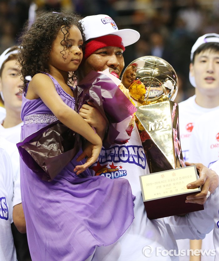 (고양=포커스뉴스) 29일 고양체육관에서 열린 2015-2016 프로농구 챔피언결정전 6차전을 승리하며 우승한 오리온 문태종이 딸과 함께 우승트로피를 들고 있다.