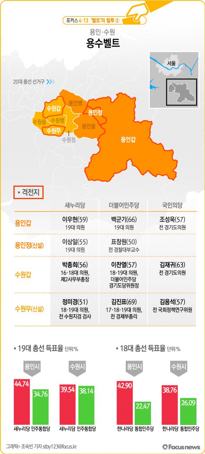 (서울=포커스뉴스) 경기도의 핵심 도시인 용인과 수원의 앞 글자를 딴 명칭인 이른바 '용수벨트'가 4.13 총선을 10여일 앞두고 주요 격전지로 떠오르고 있다.
