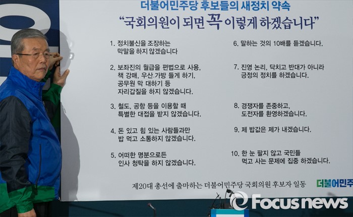 (서울=포커스뉴스) 김종인 더불어민주당 비대위 대표와 김병관 경기 성남분당갑, 황창화 서울 노원병 후보 등 20대 총선 후보들이 30일 오전 서울 여의도 국회에서 더민주 후보들의 새정치 약속 발표를 하고 있다.