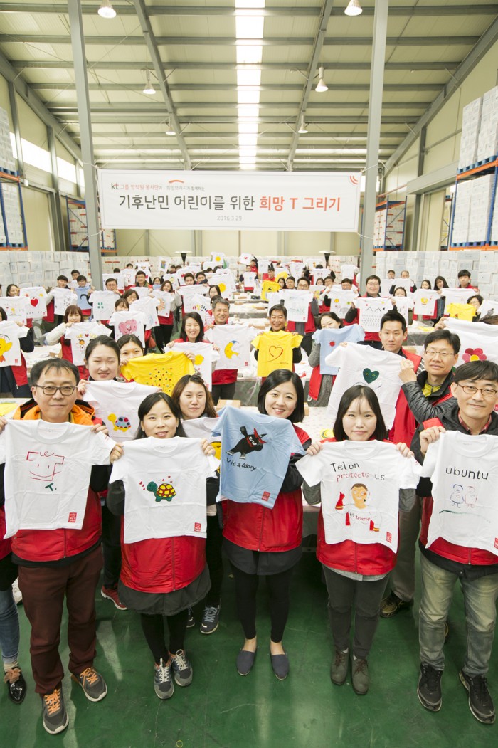 30일 KT에 따르면 이번 봉사활동에 KT, 비씨카드, 스카이라이프 등 20개 KT그룹 임직원 100명이 참여했다. 이들은 파주 재해구호물류센터에서 기후변화로 인한 홍수, 가뭄 등 자연재해로 고통 받는 전 세계 기후난민 어린이에게 희망의 메시지를 전달하기 위해 티셔츠를 제작했다.