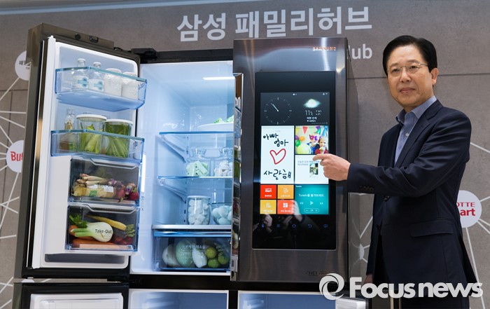 (서울=포커스뉴스) 서병삼 삼성전자 생활가전사업부 부사장이 30일 오전 서울 강남구 삼성전자 서초사옥에서 열린 '2016 삼성전자 패밀리 허브' 미디어데이에서 제품을 선보이고 있다.