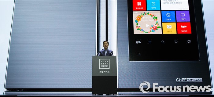 (서울=포커스뉴스) 서병삼 삼성전자 생활가전사업부 부사장이 30일 오전 서울 강남구 삼성전자 서초사옥에서 열린 '2016 삼성전자 패밀리 허브' 미디어데이에 참석해 제품소개를 하고 있다.