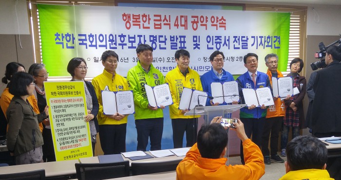 (인천=포커스뉴스) 4·13총선 인천 지역에 출마한 21명의 후보가 인천 지역 유·초·중·고교 무상급식과 관련된 시민단체의 행복한 급식 4대 정책공약에 함께 하기로 약속했다.