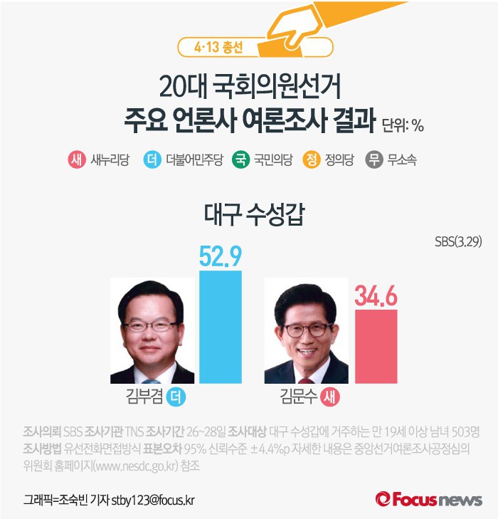 (서울=포커스뉴스) SBS가 TNS에 의뢰해 29일 발표한 여론조사 결과에 따르면 더민주 김부겸 후보가 52.9%의 지지율로 새누리당 김문수 후보(34.6%)보다 더 높은 지지를 받는것으로 나타났다.