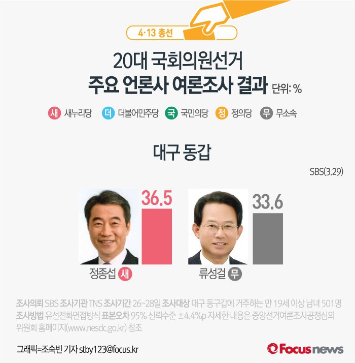 (서울=포커스뉴스) SBS가 TNS에 의뢰해 29일 발표한 여론조사 결과에 따르면 새누리당 정종섭 후보가 36.5%, 무소속 류성걸 후보가 33.6%의 지지율을 기록한것으로 나타났다.