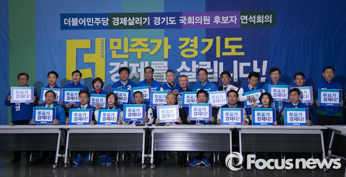 (수원=포커스뉴스) 30일 오전 수원 팔달구 경기도의회에서 열린 더불어민주당 경제살리기 경기 국회의원 후보자 연석회의에 참석한 김종인 비대위 대표, 이종걸 원내대표 등 지도부 및 후보들이 피켓을 들고 구호를 외치고 있다.