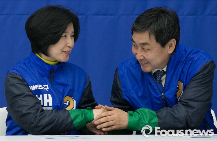 (수원=포커스뉴스) 30일 오전 수원 팔달구 경기도의회에서 열린 더불어민주당 경제살리기 경기 국회의원 후보자 연석회의에 참석한 이종걸(오른쪽, 경기 안양만안구) 원내대표와 백혜련 경기 수원을 후보가 인사하고 있다.