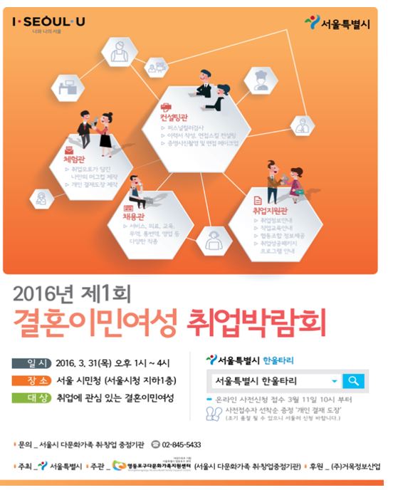 (서울=포커스뉴스) 서울시는 31일 오후 1~4시 서울 중구 시청 지하에 위치한 시민청에서 '2016 결혼이민여성 취업박람회'를 개최한다고 30일 밝혔다.