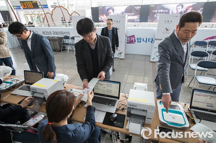 (서울=포커스뉴스) 제20대 국회의원선거를 14일 앞둔 30일 오후 서울 중구 서울역에 마련된 사전투표 모의체험장에서 시민들이 다음달 8일, 9일 실시되는 사전투표를 미리 체험할 수 있는 모의체험을 하고 있다.