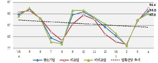 제조업은 '목재 및 나무제품'(75.5→93.9), '식료품'(87.3→99.1) 등 18개 업종이 3월보다 오른 반면, '인쇄 및 기록매체복제업'(94.7→87.5), '의료용물질 및 의약품'(104.4→99.1) 등 4개 업종은 내렸다.
