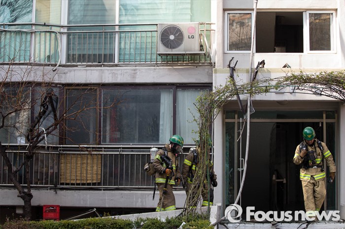(서울=포커스뉴스) 30일 오후 2시께 서울 서초구의 한 아파트에서 원인모를 불이나 소방관들이 진화작업을 하고 있다.