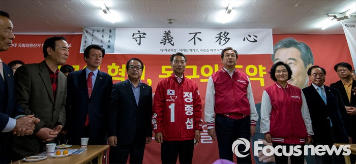(대구=포커스뉴스) 김무성 새누리당 대표가 30일 오후 대구 동구 새누리당 동구갑 정종섭 후보 선거사무소를 방문 있다.