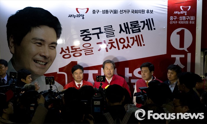 (서울=포커스뉴스) 4.13총선 공식선거운동 첫날인 31일 오전 서울 중구 동대문 누죤 앞에서 김무성 새누리당 공동선대위원장이 지상욱 서울 중구성동구을 후보와 선거운동에 앞서 취재진 질문에 답하고 있다.