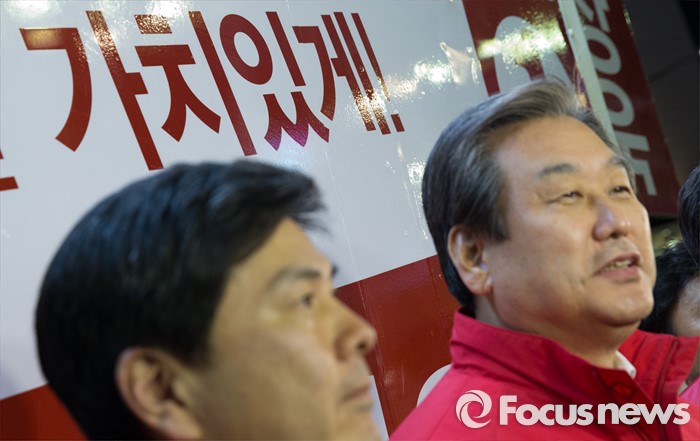 (서울=포커스뉴스) 4.13총선 공식선거운동 첫날인 31일 오전 서울 중구 동대문 누죤 앞에서 김무성 새누리당 공동선대위원장이 지상욱 서울 중구성동구을 후보와 선거운동에 앞서 취재진 질문에 답하고 있다.