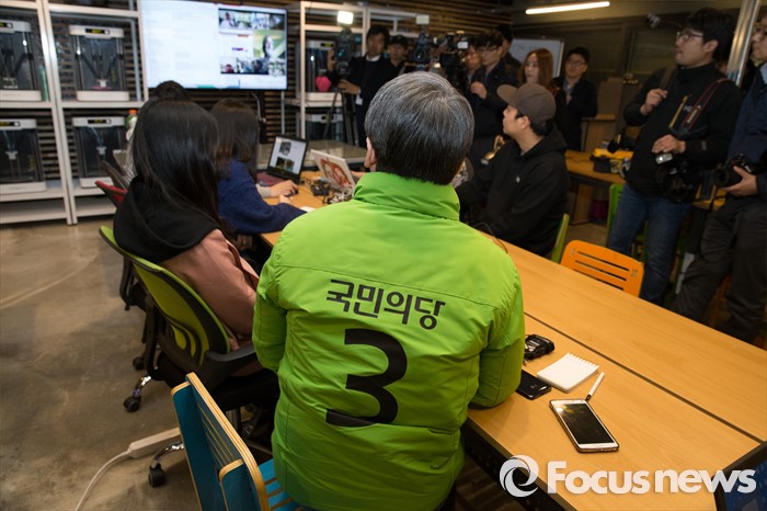 (서울=포커스뉴스) 4.13총선 공식선거운동 첫날인 31일 오전 서울 종로구 세운전자상가 '팹랩 서울(FABLAB SEOUL)'에서 안철수 국민의당 상임공동대표가 미래 일자리 청년 아카데미 수강생들과 강의를 듣고 있다.