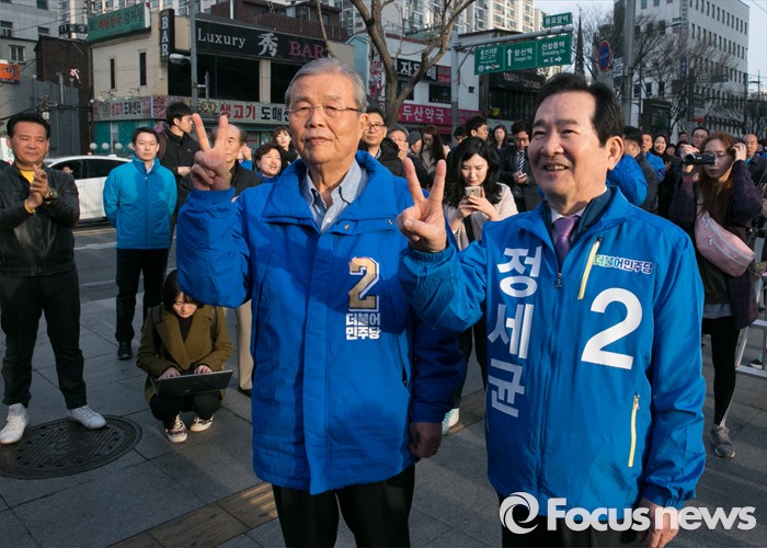 (서울=포커스뉴스) 20대 총선 공식선거 운동이 시작된 31일 오전 서울 동묘앞역 인근 거리에서 김종인(왼쪽) 더불어민주당 비대위 대표 겸 선대위원장과 정세균 서울 종로구 후보가 취재진을 향해 포즈를 취하고 있다.