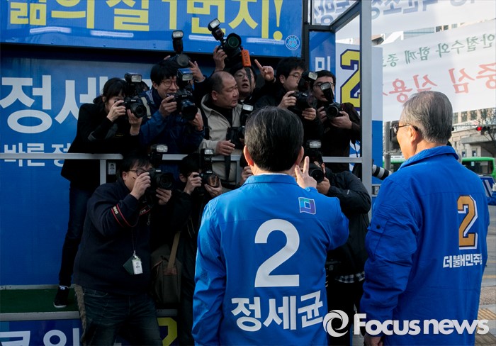 (서울=포커스뉴스) 20대 총선 공식선거 운동이 시작된 31일 오전 서울 동묘앞역 인근 거리에서 김종인(오른쪽) 더불어민주당 비대위 대표 겸 선대위원장과 정세균 서울 종로구 후보가 취재진을 향해 포즈를 취하고 있다.