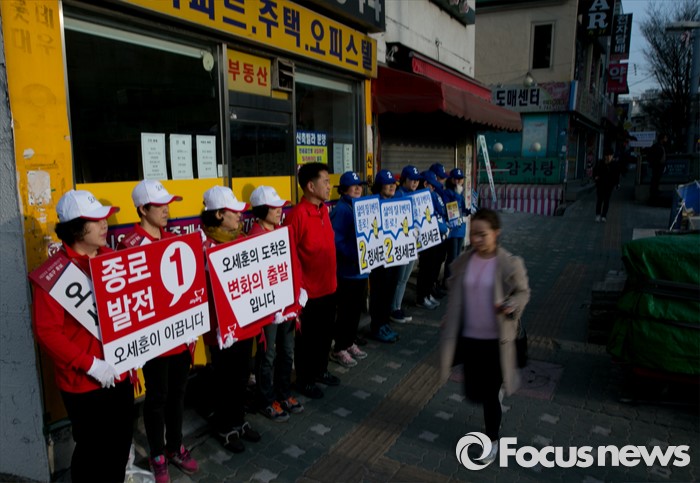(서울=포커스뉴스) 20대 총선 공식선거 운동이 시작된 31일 오전 서울 동묘앞역 인근 거리에서 오세훈 새누리당, 정세균 더불어민주당 서울 종로구 후보의 선거운동원들이 지지를 호소하고 있다.