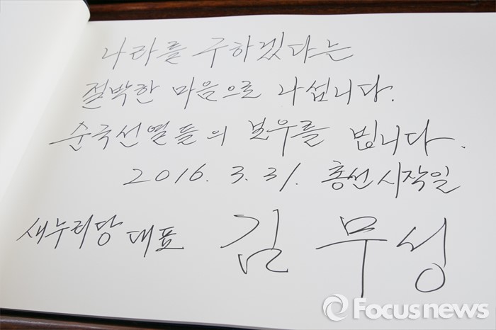 (서울=포커스뉴스) 4.13 총선 공식선거운동이 시작된 31일 오전 서울 동작구 국립현충원에서 김무성 새누리당 대표가 참배를 마친 뒤, 방명록을 작성하고 있다.