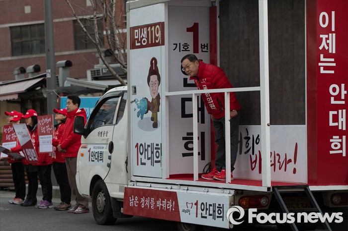 (서울=포커스뉴스) 20대 총선 공식선거 운동이 시작된 31일 오전 서울 마포구의 한 아파트 입구에서 안대희 새누리당 마포구갑 후보측이 출근길 선거유세를 하고 있다.