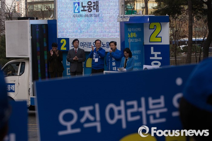 (서울=포커스뉴스) 20대 총선 공식선거 운동이 시작된 31일 오전 서울 마포구 공덕오거리에서 노웅래 더불어민주당 마포갑 후보가 출정식을 하고 있다.