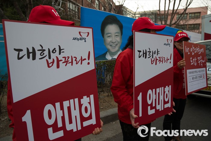 (서울=포커스뉴스) 20대 총선 공식선거 운동이 시작된 31일 오전 서울 마포구의 한 아파트 입구에서 안대희 새누리당 마포구갑 후보측이 출근길 선거유세를 하고 있다.