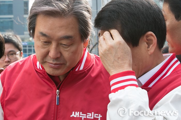 (서울=포커스뉴스) 4.13 총선 공식선거운동이 시작된 31일 오전 서울 구로구 구로디지털단지역 인근 한 대형마트 앞에서 김무성(왼쪽) 새누리당 대표와 이군현 공동 총괄본부장이 대화하고 있다.