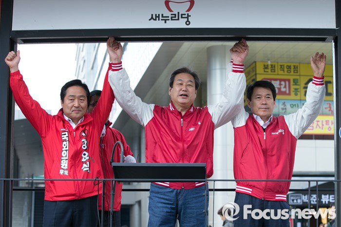 (서울=포커스뉴스) 4.13 총선 공식선거운동이 시작된 31일 오전 서울 구로구 구로디지털단지역 인근 한 대형마트 앞에서 김무성(가운데) 새누리당 대표가 강요식(왼쪽) 구로을 후보 지원유세 참석해, 손을 들고 있다. 오른쪽은 이군현 공동총괄본부장.