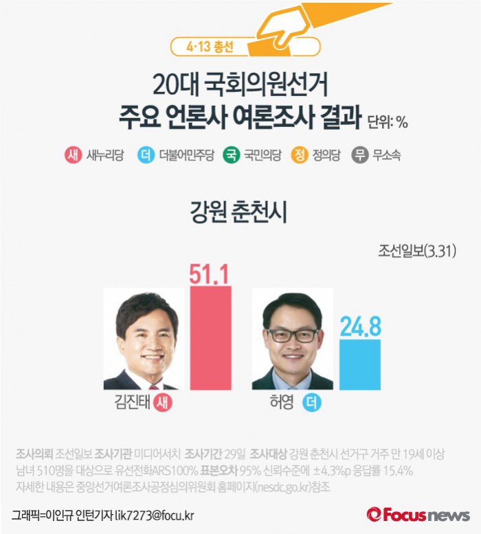 춘천은 지난 17대 총선에서 새누리당의 전신인 한나라당이 승리한 이후 19대까지 여당 후보다 당선된 지역이다. 이번 여론조사 결과가 선거가 끝날 때까지 이어질 경우 새누리당이 4연승을 기록하게 된다.