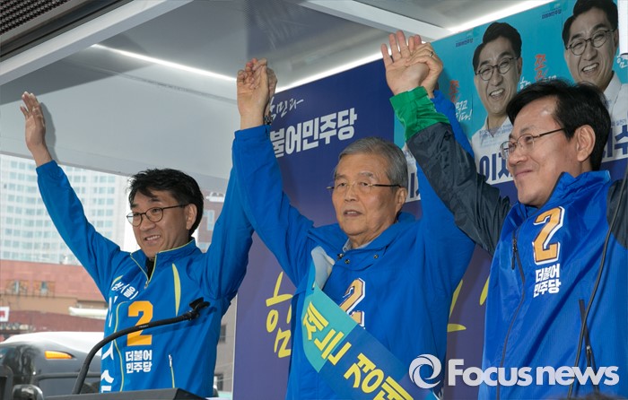 (서울=포커스뉴스) 20대 총선 공식선거 운동이 시작된 31일 오전 서울 남대문시장에서 열린 더불어민주당 중앙선거대책위원회 출정식에 참석한 김종인(가운데) 비대위 대표 겸 선대위원장, 이지수(왼쪽) 중구성동을 후보, 오영식 유세단장이 손을 들어 인사하고 있다.