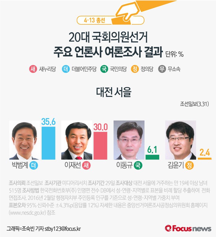 (서울=포커스뉴스) 더불어민주당 박범계 의원과 새누리당 이재선 후보가 맞붙는 대전 서을에서 박 의원이 지지율 1위를 달리는 것으로 나타났다. 이 후보는 오차범위 내에서 그 뒤를 쫓고 있다.