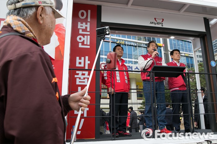 (서울=포커스뉴스) 4.13 총선 공식선거운동이 시작된 31일 오전 서울 구로구 구로디지털단지역 인근 한 대형마트 앞에서 김무성(오른쪽 두번째) 새누리당 대표가 강요식 구로을 후보 지원유세를 하고 있다.