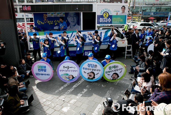 (서울=포커스뉴스) 20대 총선 공식선거 운동이 시작된 31일 오전 서울 남대문시장에서 열린 더불어민주당 중앙선거대책위원회 출정식에 앞서 선거운동원들이 로고송에 맞춰 율동을 선보이고 있다.