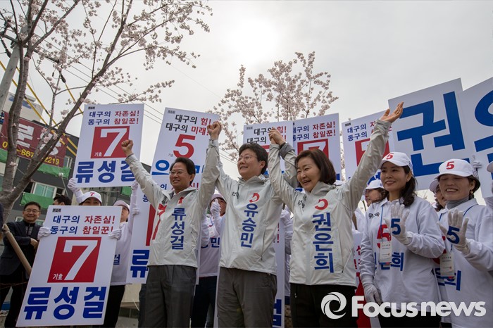 (대구=포커스뉴스) 무소속 대구 동구을 유승민(가운데) 후보, 무소속 대구 북구갑 권은희(오른쪽) 후보, 무소속 대구 동구갑 류성걸 후보가 31일 오전 대구 동구 공항교에서 열린 공동 출정식에 참석해 손을 맞잡고 있다.