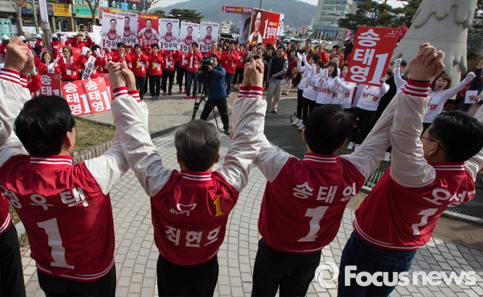 (청주=포커스뉴스) 20대 국회의원 선거유세가 시작된 31일 오전 충북 청주시 사직동 분수대 앞에서 새누리당 후보자들이 출정식을 갖고 필을을 다짐하고 있다.