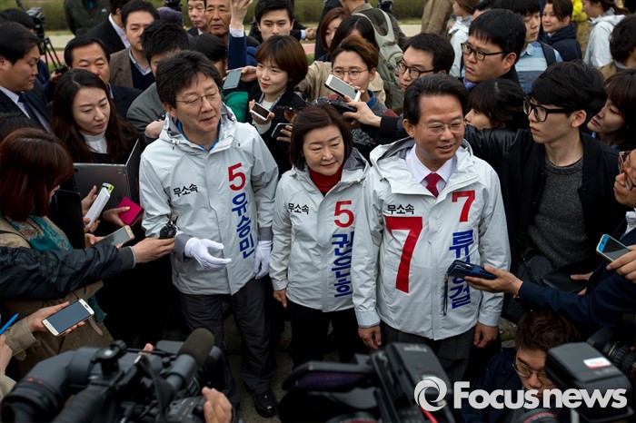(대구=포커스뉴스) 무소속 대구 동구을 유승민(왼쪽) 후보, 무소속 대구 북구갑 권은희(가운데) 후보, 무소속 대구 동구갑 류성걸 후보가 31일 오전 대구 동구 공항교에서 열린 공동 출정식에 참석해 취재진에게 질문을 받고 있다.