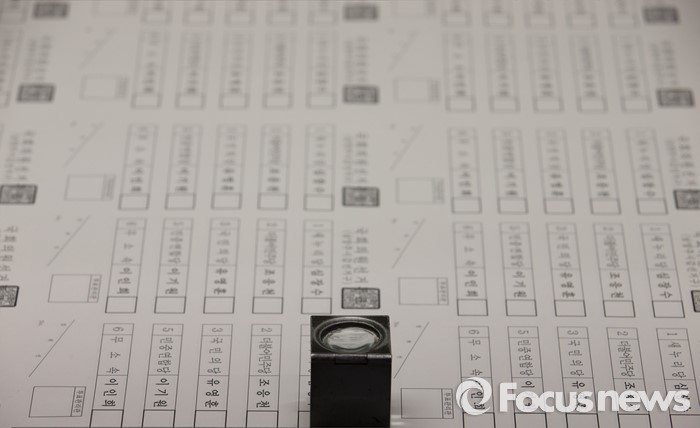 (파주=포커스뉴스) 제20대 총선 선거운동이 공식적으로 시작된 31일 오전 경기도 파주 한 인쇄소에서 투표용지 위에 돋보기가 놓여져 있다.