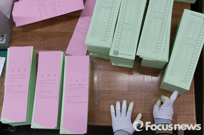 (파주=포커스뉴스) 제20대 총선 선거운동이 공식적으로 시작된 31일 오전 경기도 파주 한 인쇄소에서 직원들이 투표용지를 인쇄해 분류작업을 하고 있다.