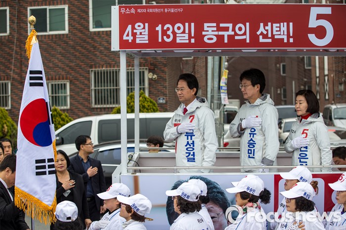 (대구=포커스뉴스) 무소속 대구 동구을 유승민(가운데) 후보, 무소속 대구 북구갑 권은희(오른쪽) 후보, 무소속 대구 동구갑 류성걸 후보가 31일 오전 대구 동구 공항교에서 열린 공동 출정식에 참석해 국민의례를 하고 있다.