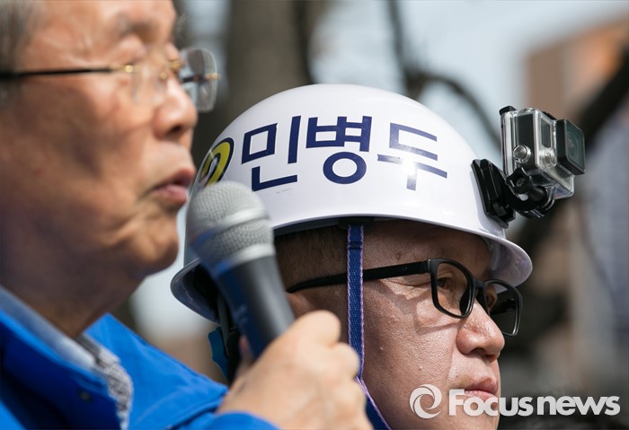 (서울=포커스뉴스) 20대 총선 공식선거 운동이 시작된 31일 오전 서울 장안동사거리에서 열린 민병두 더불어민주당 동대문을 후보 출정식에 참석한 민(오른쪽) 후보가 김종인 비대위 대표 겸 선대위원장의 지지 호소를 듣고 있다.